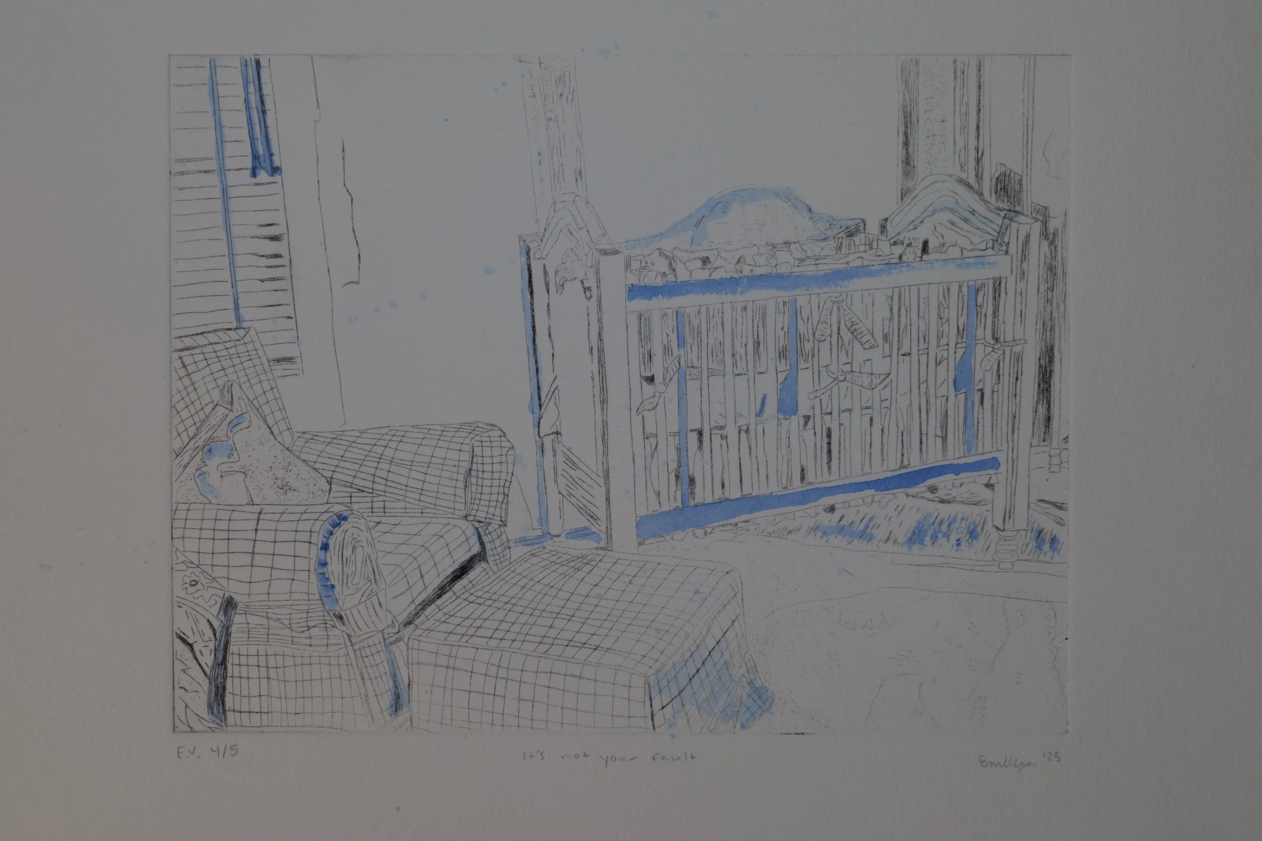 Drypoint print of a nursery with watercolor on top. Each print is an edition variay (may be slightly different than pictured)